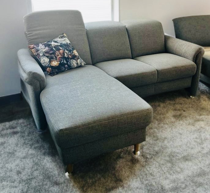 Bequemes, hochwertiges Sofa in neutralen Grauton mit Ottomane. der angenehme Sitzkomfort lädt zum verweilen ein.